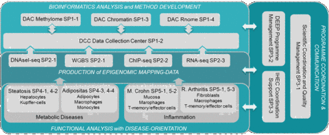 Deep is assembled on three interacting scientific platforms: production of epigenomic mapping-data, bioinformatics analysis and method-development and functional analysis with disease-orientation (see Figure 1, Table 1). The disease-oriented platform will contribute expertise to isolate highly purified cell types/tissues for epigenomic mapping and will analyse cell type-/ tissue-associated aspects of the complex diseases. The epigenomic sequencing units will generate primary epigenomic mapping-data that will be submitted to a central data collection unit and interpreted in close collaboration with central bioinformatics units responsible for high quality public data deposition and deep functional interpretation. A programme coordination and communcation platform will monitor the quality controlled data generation and foster interactions between bioinformatics and experimental analysis groups across platforms. DEEP will further coordinate its activities with IHEC and other epigenetic initiatives to establish unified standards for epigenomic data and for scientific exchange. Along this line DEEP will support IHEC in its dissemination activities through a DEEP associated coordination office.
